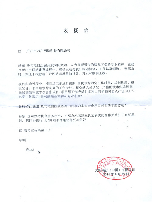 客户真情的表扬绝不是偶然的,大新银行门户网站建设项目组在工期紧、任务重的客观条件下,保持专业精神,积极沟通协调,工作认真细致,响应及时,确保了客户新门户网站保质保量如期顺利上线,展现了万户网络作为17年老牌高端网站建设公司在银行网站建设领域应有的专业水准与实力!