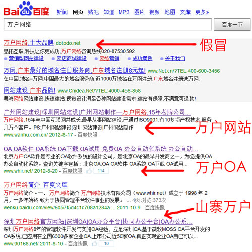 百度是众多IT企业开展网络营销的主要方法,记者在百度搜索“万户网络”,出现如下内容: