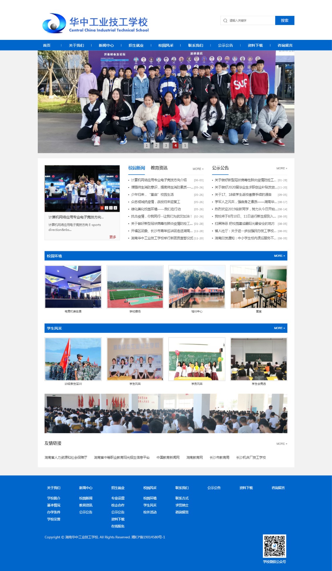 本页面展示为长沙万户设计制作的湖南华中工业技工学校网站部分页面截图。
