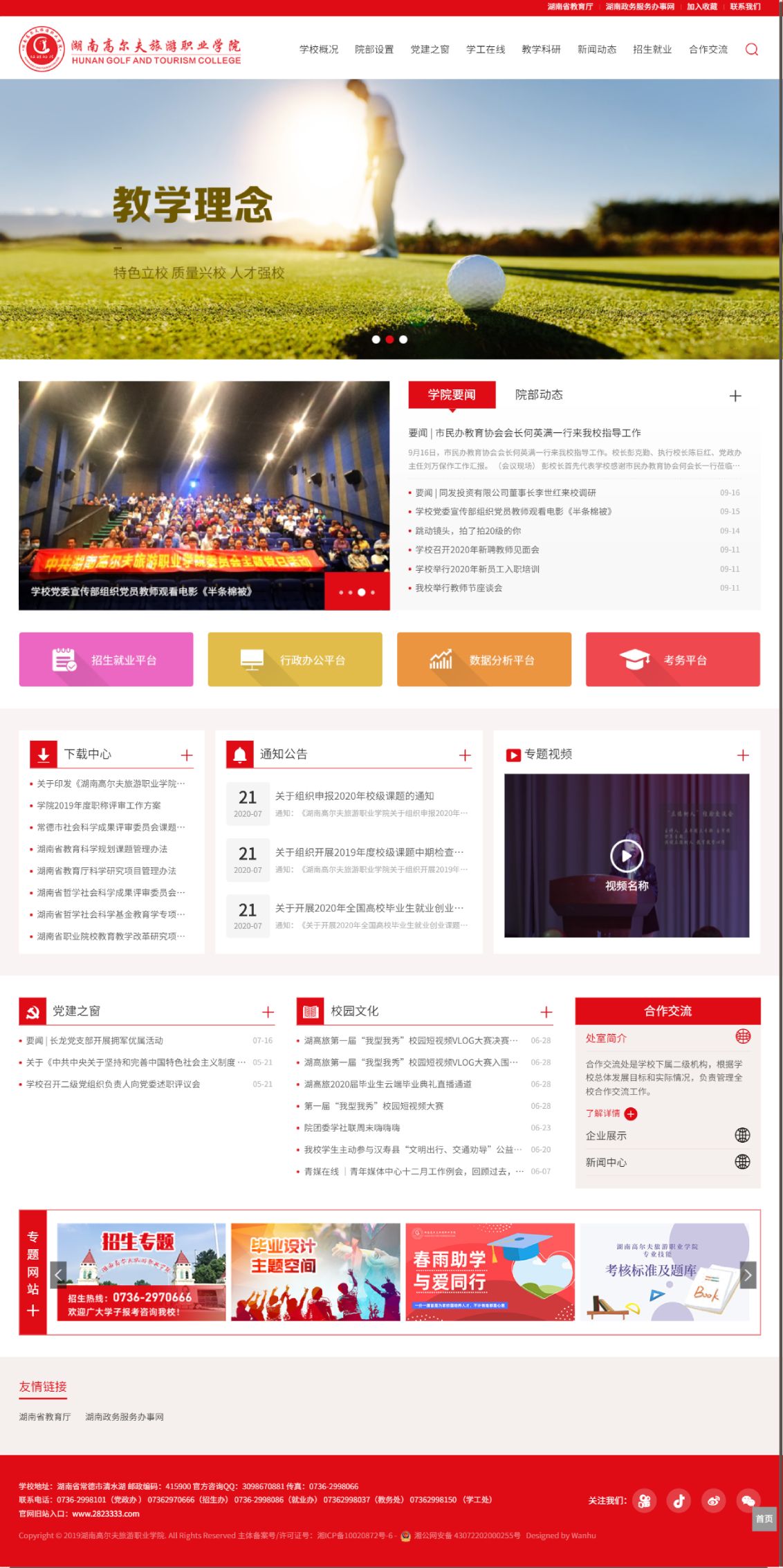 本页面展示为长沙万户设计制作的湖南高尔夫旅游职业学院网站部分页面截图。