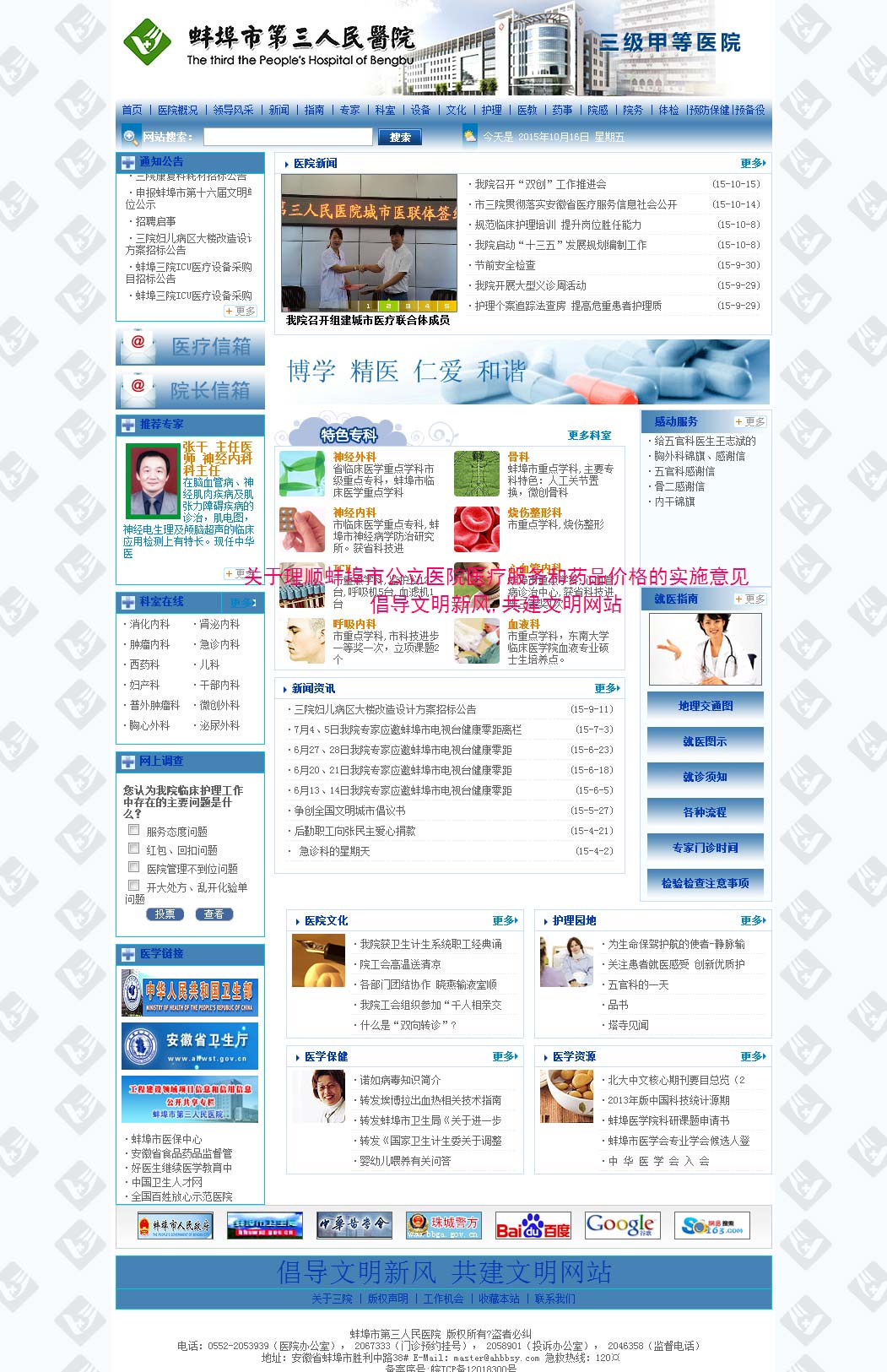 蚌埠市第三人民医院是三级甲等医院,2004年增名“蚌埠市中心医院”。医院始建于1954年4月,现已发展成为专业科室齐全、人才结构合理、技术力量雄厚、医疗设备先进、专业特色突出,集医疗、科研、教学、预防、康复为一体的皖北地区规模较大的一所综合性医院。