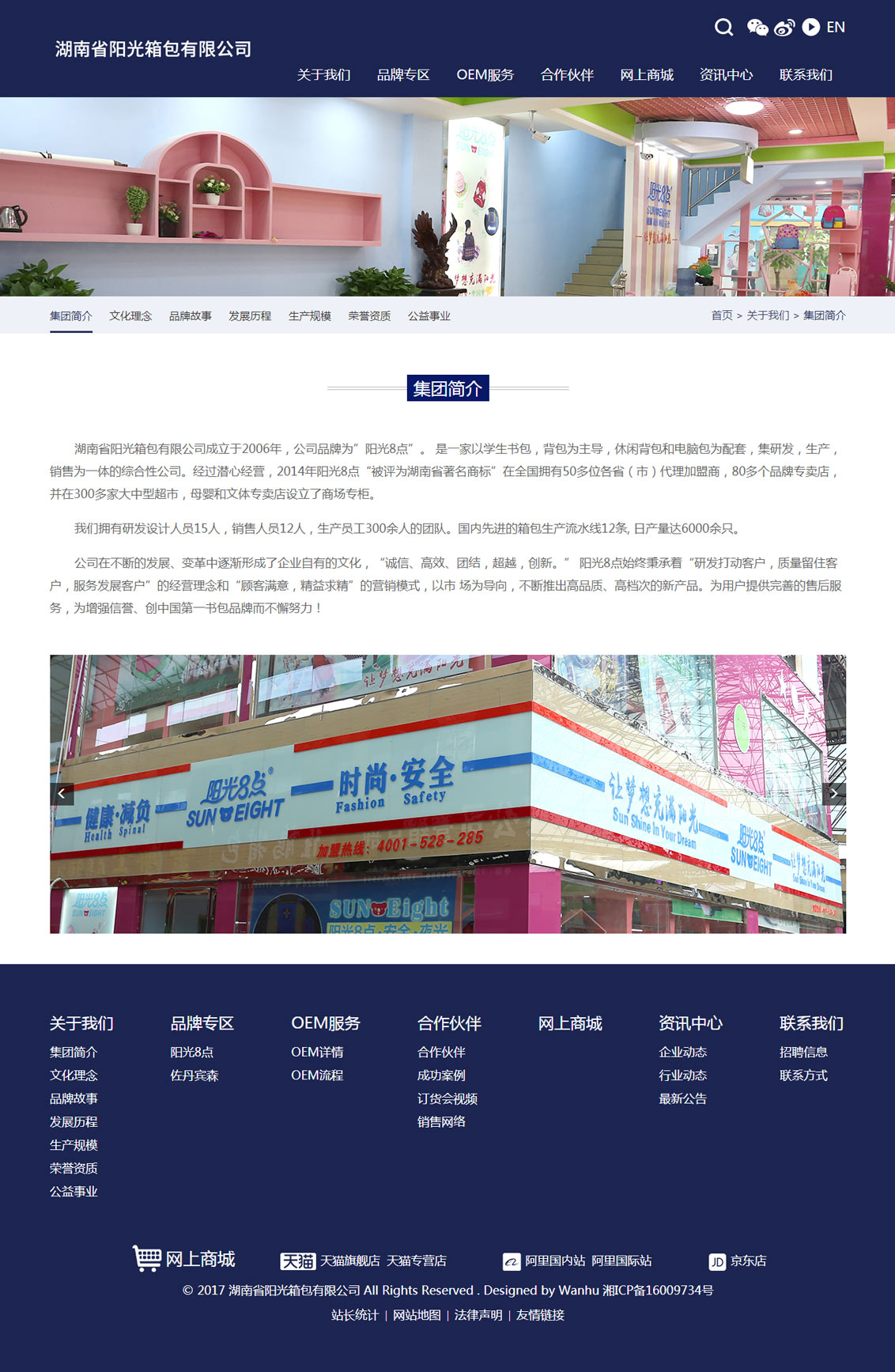 本页面展示为万户网络设计制作的湖南省阳光箱包有限公司网站部分页面截图。