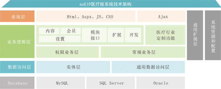 万户医院网站管理系统(ezEIPv4(医疗版))平台设计目标就是面向各地三甲医院,功能页面从大型定制开发到模板快速建站的用户,提供满足大规模用户访问并具有良好扩展性的网上医院信息管理系统。产品技术架构选用Asp.net平台,使用PetaPoco作为核心框架,采用SOA分层提供服务支持的设计思想,将系统划分为数据库层、中间件层、业务应用层和表现层。